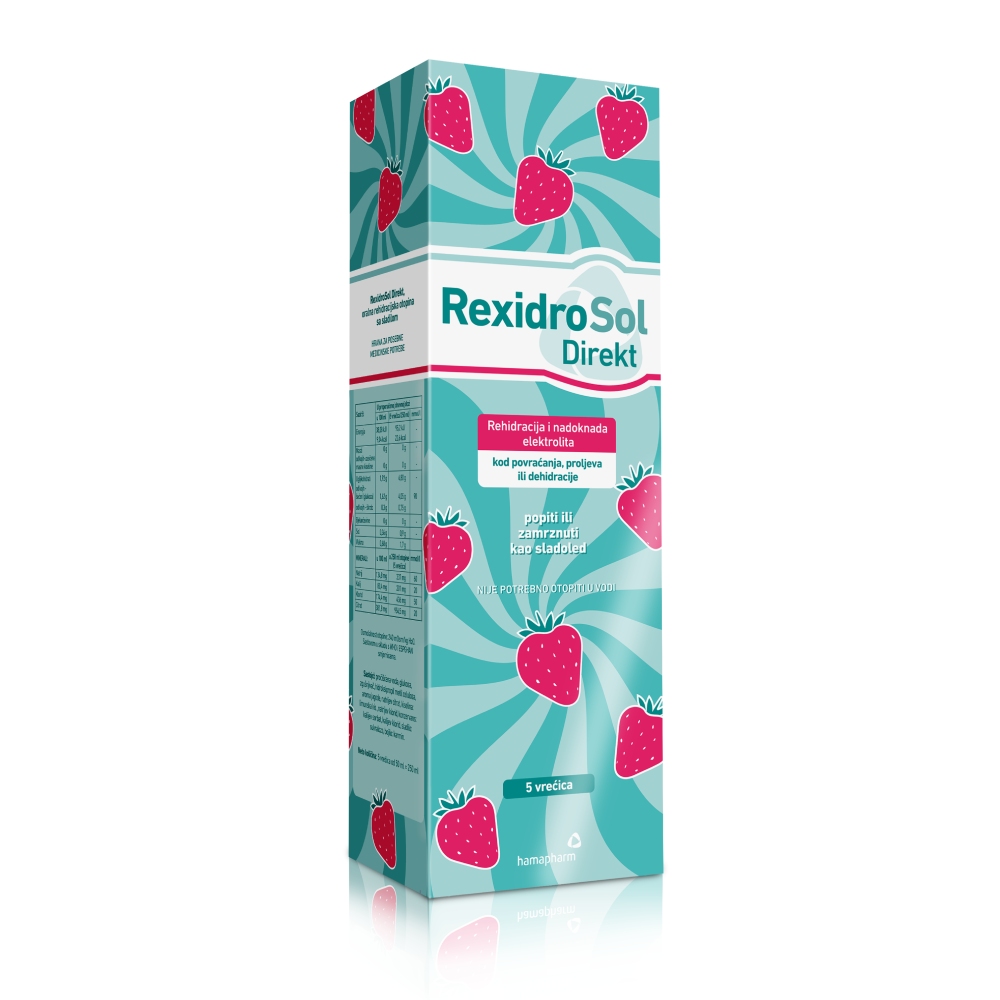 Hamapharm RexidroSol Direkt je oralna rehidracijska otopina s okusom jagode i namijenjen je za dijetalnu prehranu bolesnika s gubitkom elektrolita i vode, kod povraćanja i proljeva. Primjenjuje se kod rehidracije i nadoknade elektrolita, u prevenciji dehidracije i održavanju hidracije kod djece i odraslih.