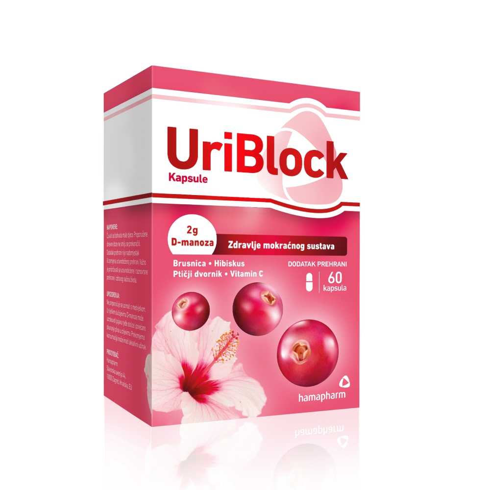 UriBlock kapsule podržavaju zdravlje mokraćnog sustava. Sadrže D-Manozu, brusnicu, hibiskus, ptičji dvornik i vitamin C za sprječavanje prianjanja bakterija, poticanje izlučivanja te jačanje imuniteta.