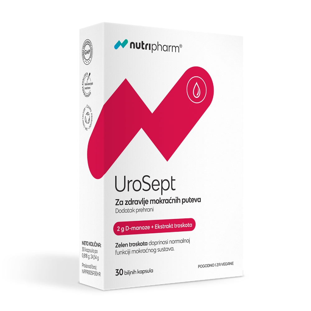 Nutripharm UroSept je dodatak prehrani u obliku kapsula koji sadrži D-manozu i ekstrakt zelenog troskota (Polygonum aviculare).