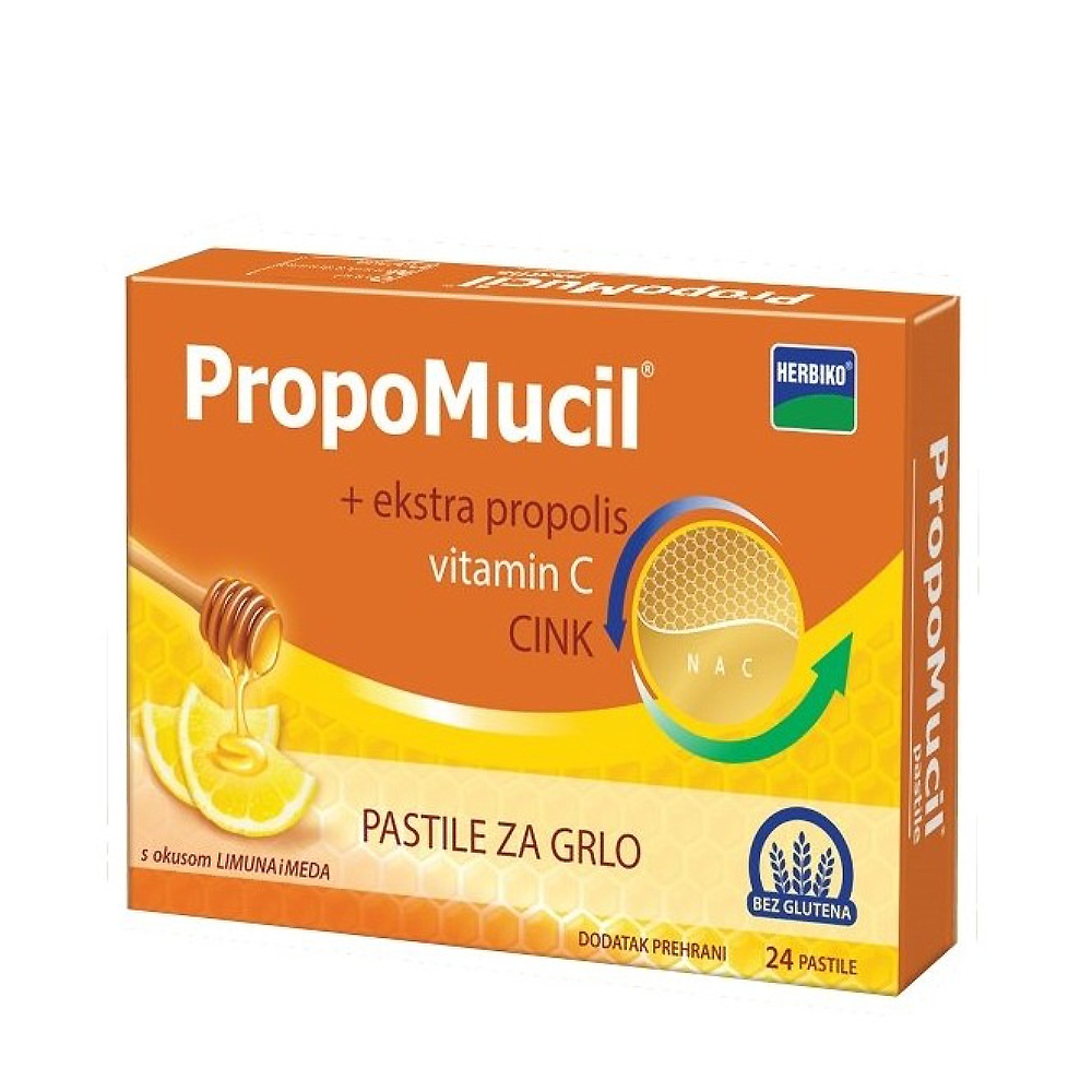 PropoMucil pastile za grlo sadrže ekstrakt propolisa, vitamin C i cink. Pastile imaju okus meda i limuna.